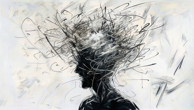 Chaotic scribbles and sketches burst from human figure head, symbolizing mental pressure and overwhelming thoughts. This artwork captures complexity of mind