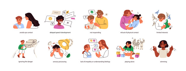 Autism signs set. Autistic behaviour, mental health disorder, cognitive problem symptoms. Kids development delay. Child ASD spectrum awareness. Flat vector illustration isolated on white background