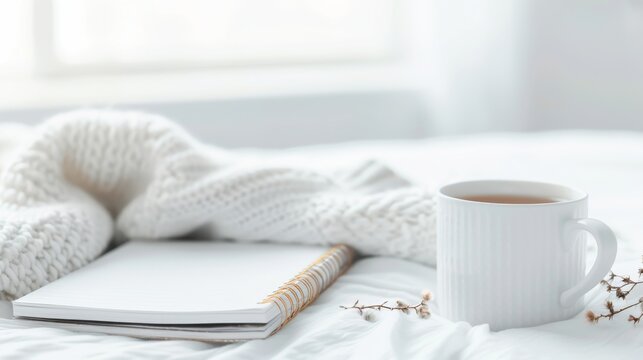 Cozy morning scene with a cup of tea, a soft blanket, and a notebook on a white bed, perfect for relaxation and tranquility.