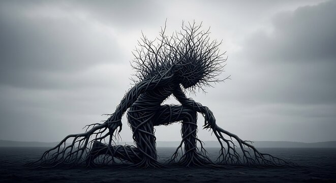 Conceptual dark art depicting a sorrowful tree-like figure kneeling. Ideal for mental health awareness, grief support, or nature-themed dark fantasy projects. Eerie, powerful visual.