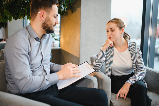 Counselling, help and woman on sofa talking to therapist, counsellor or guide for mental health, balance or wellness. Psychology, session and client consulting expert for stress or anxiety management