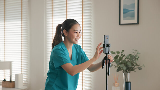 Young adult woman asia Gen Z people anti aging expert modern nurse live talk prepare video selfie camera on mobile phone app mental health care Online side hustle digital virtual asian vlogger filming
