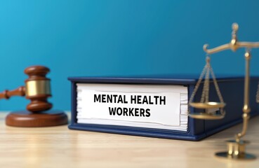Illustration showcases legal aspects of mental health field with focus on workers. Gavel scales and file folder represent law judgement and advocate in the sphere.