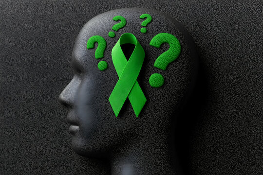 A silhouette of a head with a green ribbon and question marks, symbolizing mental health awareness and the importance of understanding.