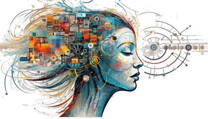 Captivating silhouette of a woman with clouds merging into her head, symbolizing creativity and inspiration. Perfect for projects related to imagination, dreams, and mental health themes.