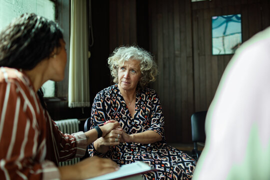 Work addict people talking on group therapy meeting, sitting in circle, discussing addiction, mental health problems. Counselor speaking, giving support and advice to team for successful recovery
