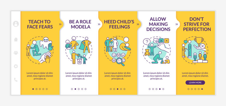 Bringing up tips yellow onboarding vector template. Responsive mobile website with icons. Web page walkthrough 5 step screens. Child mental health color concept with linear illustrations