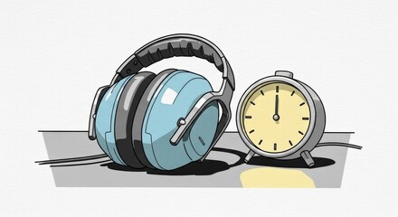 Noise cancelling headphones and timer illustration, minimalist style, calming colors, representing focus and anxiety relief tools