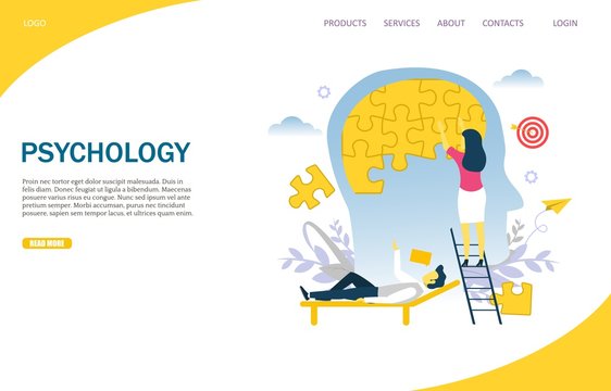 Psychologists doctors people connecting jigsaw puzzle pieces of head. Mental health support flat vector illustration. Psychological help concept for banner, website design or landing web page