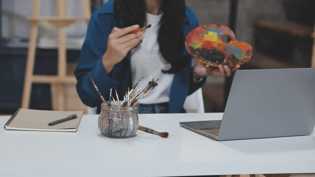 Young girl asian sitting and painting watercolour artwork to develop abilities and improve mental health at home .Female artist drawing with inspiration.