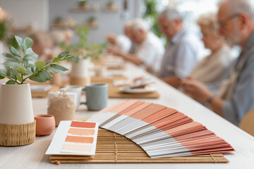 Picture Name: Close-Up on Empty Bamboo Mat Table in Indoor Creative Workshop with Blurred Elder People Engaged in Watercolor Painting and Paper Crafts, Featuring Healthy Palette for Longevity Activity