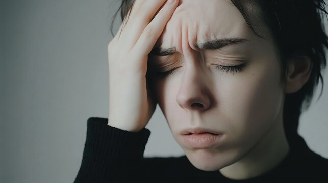 The image captures a woman experiencing discomfort, holding her temples in stress, highlighting the impact of emotional strain and the importance of mental health awareness.