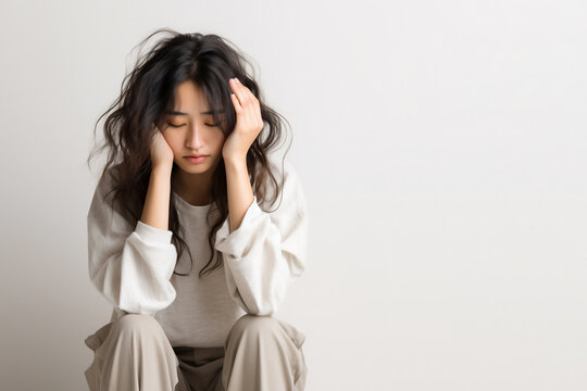 Beautiful, stylish young Asian woman in casual white and beige sit, put her head in her hand, eyes closed, feeling sad, depressed, stressed, headache. Self care, mental health disorder and wellbeing