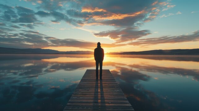 Man Reflecting on Pier at Sunrise - Promoting Mindfulness and Mental Wellbeing, Perfect for Wellness Promotion