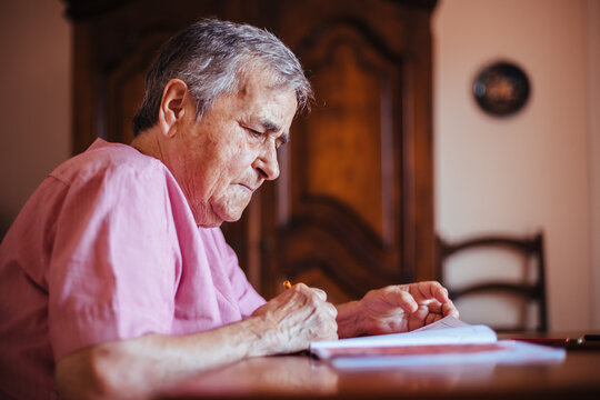 Side view of a senior woman with Alzheimer's mental health issues painting on a notebook inside her home
