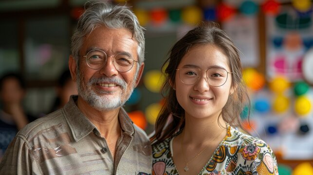 A diverse group of teachers standing proudly on a stage, each holding a certificate of recognition, surrounded by appreciative students, World Teachers Day, education, recognition
