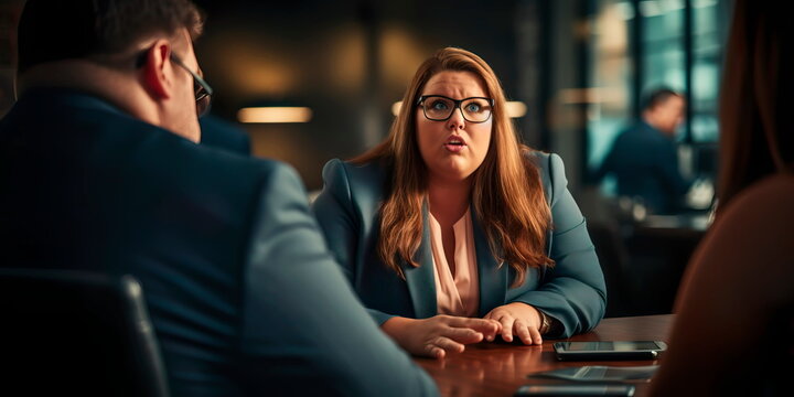 plus-size manager conducting a performance review, emphasizing her professionalism and commitment to employee development. Generative AI