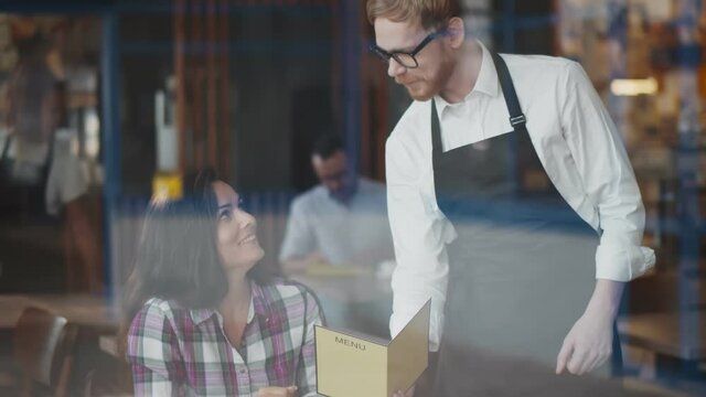 Polite asian waitress taking order from couple sitting at table in restaurant. Guests choosing dishes from electronic menu in smartphones. Interactive restaurant ordering system concept