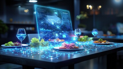 AI-driven meal customization, holographic menu with options, floating above a plate, soft restaurant lighting