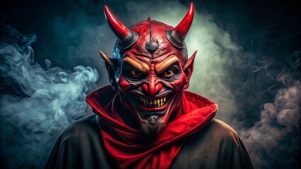 A mysterious figure wears a red devil mask with horns and a wicked grin, evoking a sense of playfulness and mischief in a dark atmosphere.