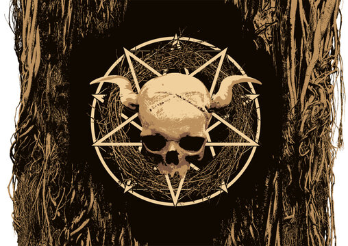 Vector illustration of a bloody human skull, horns, a pentagram, a circle, a tree, branches, and roots in a grunge style. Symbol of Satanism. Design for t-shirts, logos, and music covers. No AI.