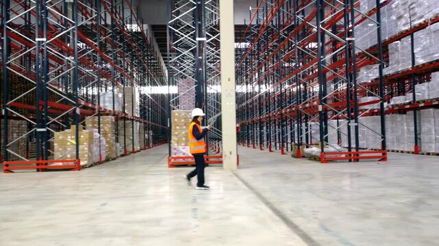Female supervisor wearing safety vest and helmet inspecting goods and merchandise on shelves in large distribution center