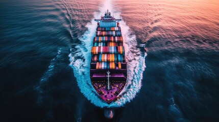 Large cargo ship with colorful containers sailing on open sea, aerial view showing wake and ocean expanse