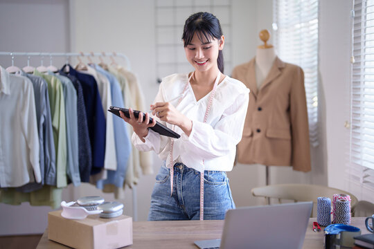 Young asian merchant women wearing measure tape in her neck and writing client information in digital tablet while checking purchase online order on laptop and working about online shopping business