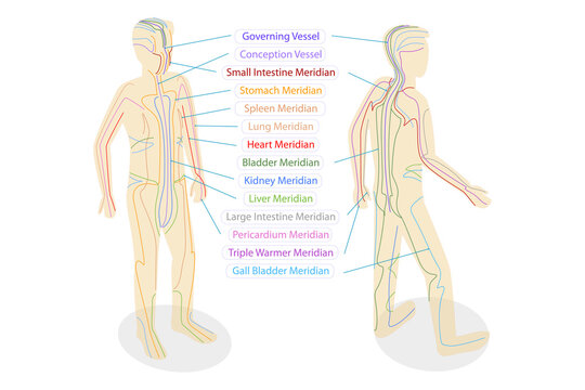 3D Isometric Flat  Conceptual Illustration of Body Meredians, Traditional Chinese Medicine
