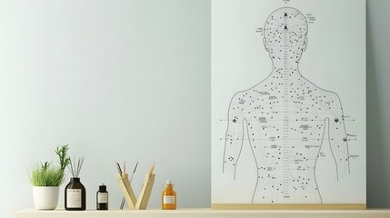 Acupuncture meridian chart hanging on the wall in a minimalist serene wellness room setting  The chart represents the holistic approach of traditional Chinese medicine