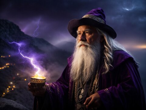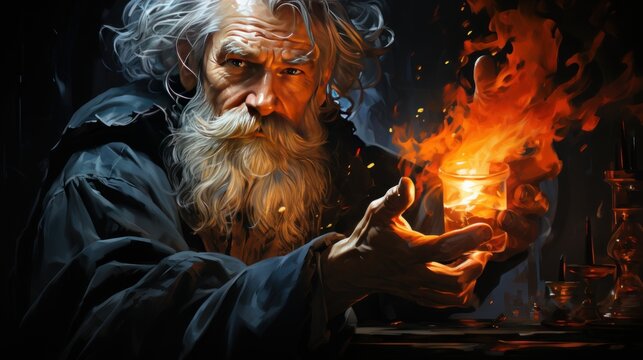 An old man with a sphere of fire in his hands. Magical greatness.