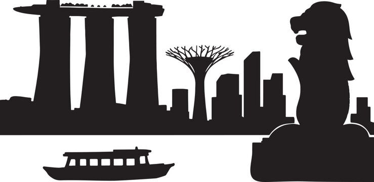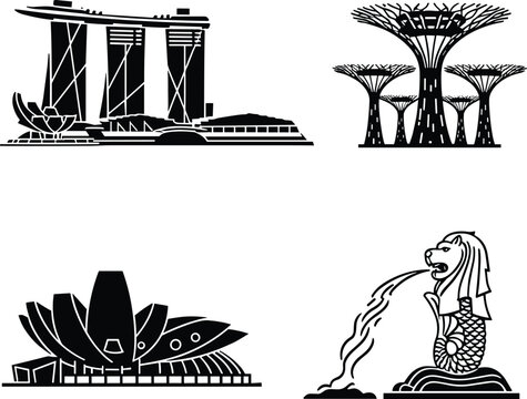 Singapore's Iconic Landmarks Vector Collection: Merlion, Marina Bay Sands, Supertrees, and ArtScience Museum Silhouettes