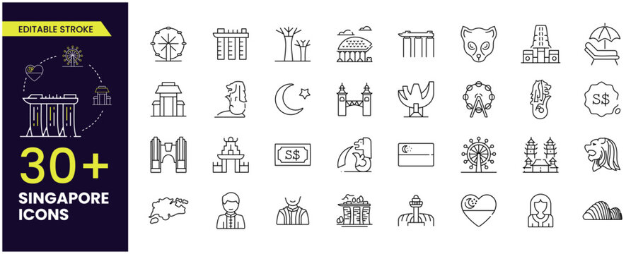 Country Singapore, Stroke icon collection. Set of architecture, fashion, people, item, nature background concept. Infographic traditional ethnic flat, outline, thin line icon