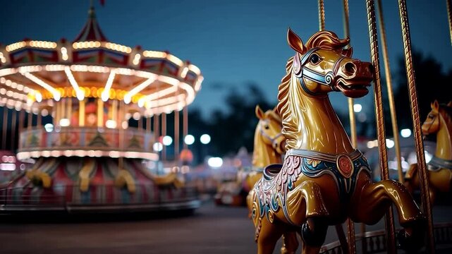 Close-up of a carousel horse with detailed ornaments illuminated at night in an amusement park setting blurred background lights and dark blue sky ambiance.