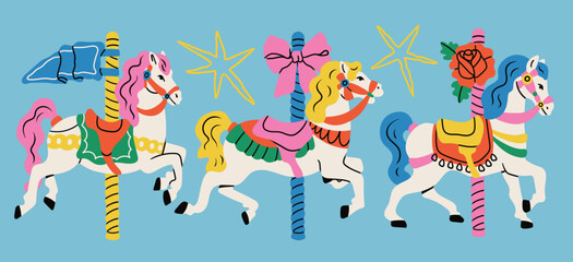 Carousel horses set. Cute bright colorful merry go round horses. Retro vintage carousel style. Hand drawn modern Vector illustration. Isolated design elements. Print, logo, sticker templates