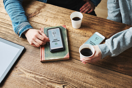 Money transfer. Online banking. People transferring money online using applications for send and receive money on smartphones. Friends making money transfers. Digital wallet. Paying online shopping