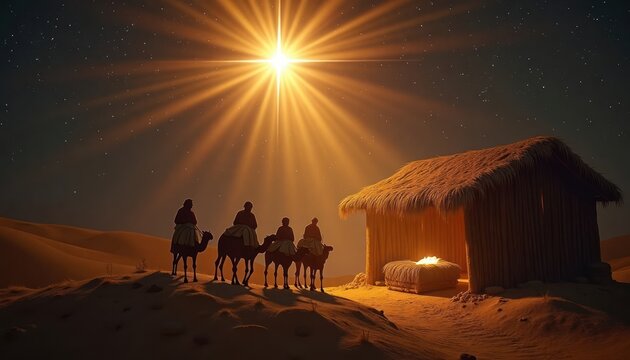 Three travelers on camels approach simple stable in desert landscape. Bright star shines above holy birth. Desert scene at night with small stable. Light from star highlights stable jesus born.