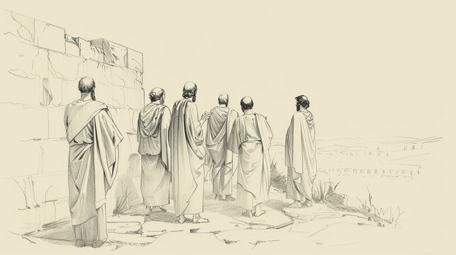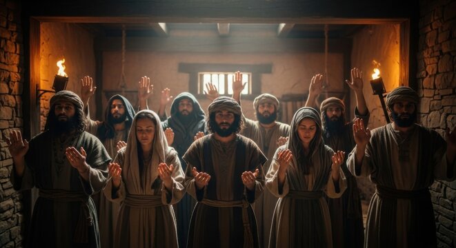 Religious men and women praying with raised hands in ancient setting. First Christians prayer, biblical times and Pentecost concept.