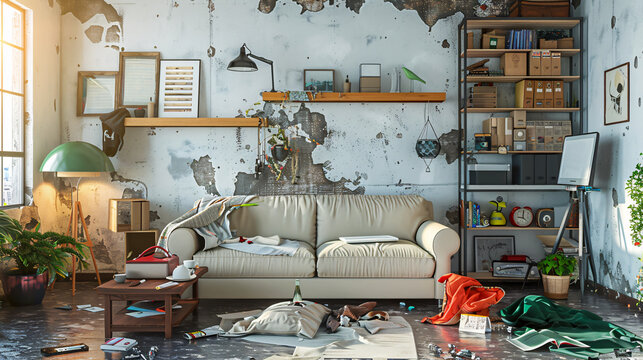 Messy living room with table, cloth, paper, mugs, wire, sofa, furniture with books an a clock, window, illustration created with Generative AI technology
