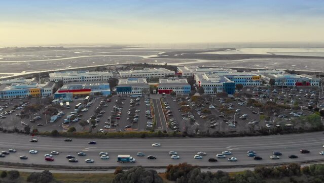 Aerial view of the Facebook Meta headquarters. Shows the office building, freeway traffic, and surrounding wetlands. Menlo Park, California, USA.