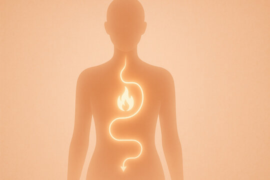 Active woman in a gym touching her stomach with glowing digestive organs illustration. Concept of metabolism support, gut health, fitness, and healthy lifestyle.