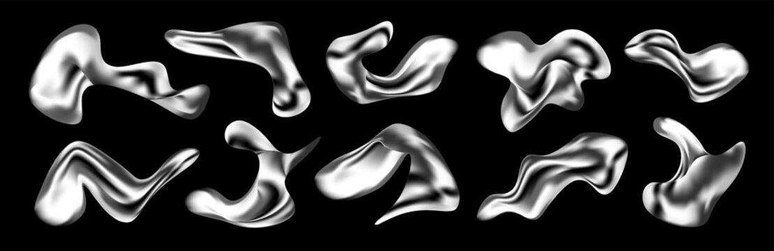 Y2K Melty chrome shapes isolated. Spilled liquid metal drops. Futuristic metallic puddles