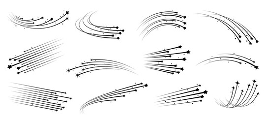 Christmas starburst, shooting stars, falling comets with trails and traces, space meteor silhouettes. Monochrome vector set, streaks of light and energy, creating a sense of motion and cosmic elegance