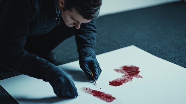 A criminal investigator analyzing a blood stain at a crime scene. Featuring meticulous examination and forensic analysis
