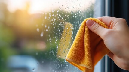 Cleaning water stains from modern apartment windows during sunset