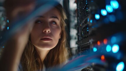 A young male technician working in a data center, connecting blue cables to a network switch on the wall.