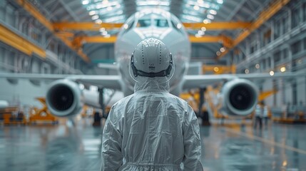 A technician in white protective clothing stands before a massive aircraft, focused and ready for inspection in a well-lit hangar