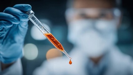 Scientific Precision: A lab technician with gloved hand carefully handles a pipette filled with a vibrant orange liquid. This image conveys the meticulous nature of scientific research.