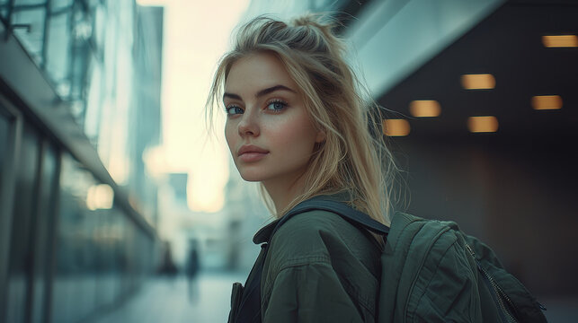 Stylish woman in olive green jacket radiates confidence in a vibrant urban environment with modern architecture and soft streetlight glow