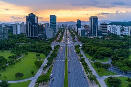 A stunning cityscape at dusk featuring illuminated skyscrapers, modern highways, and vibrant urban lights in a bustling metropolitan area
